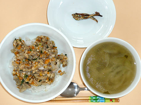 混ぜごはん(親鶏ミンチ、蓮根、小葱、突き出し蒟蒻、生姜、すりごま、もち麦、白米)炒め物(じゃが芋、蓮根、青のり)味噌汁(絹ごし豆腐、えのき、青梗菜)いりこ