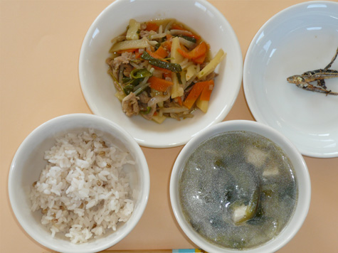 けんちん汁(木綿豆腐、ごぼう、人参、しめじ、里芋、小松菜、蒟蒻、きざみ揚げ)人参しりしり(人参、ツナ、コーン)ごはん(乾燥ワカメ、押麦、白米)いりこ