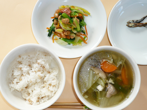 スープ(鶏モモ肉、白菜、キャベツ、人参、白ネギ、水菜、ごぼう、干し椎茸、豆腐、生姜)和え物(中粒納豆、小松菜、白菜、人参、梅肉、かつお節)ごはん(もち麦、白米)いりこ(ソース味)