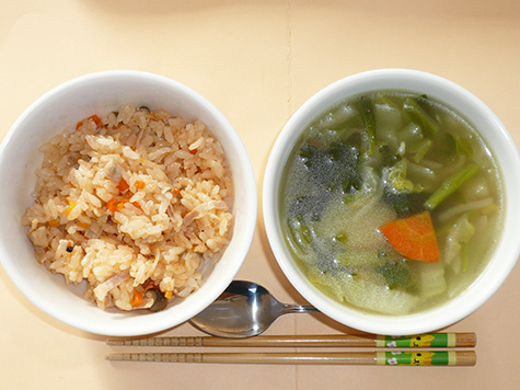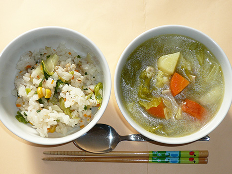 スープ(鶏肉、干し椎茸、キャベツ、人参、玉葱、しめじ、青梗菜、ブイヨン)ピラフ(野菜ミックス、ちりめん、コンソメ、ブイヨン、押し麦、白米)