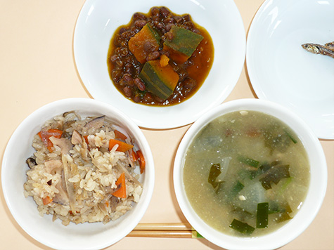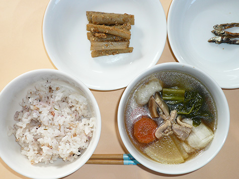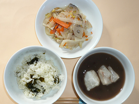 五目ごはん(若鶏ミンチ、人参、ごぼう、蓮根、干し椎茸、板蒟蒻、きざみ揚げ、白米)いとこ煮(小豆、かぼちゃ)納豆汁(ひきわり納豆、なめこ、島原わかめ、にら、大根)いりこ