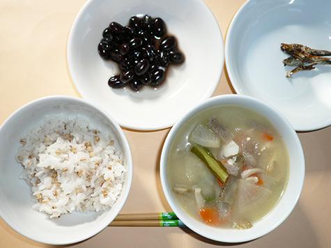 豚汁(豚肉、じゃが芋、人参、玉葱、ほうれん草、かぼちゃ、キャベツ、しめじ、切干し大根、糸蒟蒻、きざみ揚げ)ごはん(赤米、押し麦、白米)いりこ