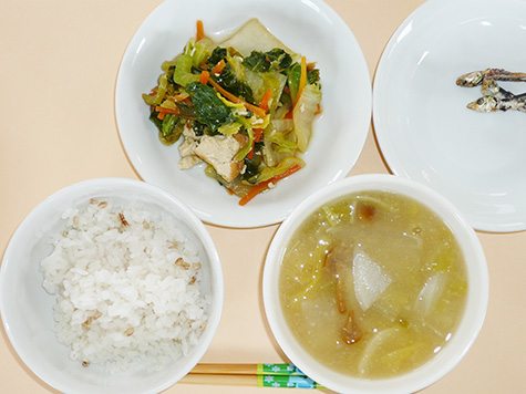 豚汁(豚こま肉、さつまいも、玉葱、白菜、人参、大根、ごぼう、糸蒟蒻)ごはん(ひじきふりかけ、白米)いりこ